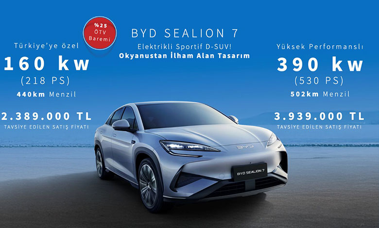 BYD, Türkiye’de ürün gamını yüzde 100 elektrikli sportif D-SUV modeli BYD SEALION 7 ile genişletiyor. Türkiye’ye özel olarak geliştirilen 160 kW gücündeki arkadan itişli versiyonun yanı sıra, 390 kW gücündeki dört çeker seçeneğiyle öne çıkan BYD SEALION 7, Kasım ayı itibarıyla BYD bayilerinde yerini alacak. Modelin 160 kW’lık Design versiyonu 2.389.000 TL, 390 kW’lık Excellence donanım versiyonu ise 3.939.000 TL Kasım ayına özel lansman fiyatları ile satışa sunuluyor.
