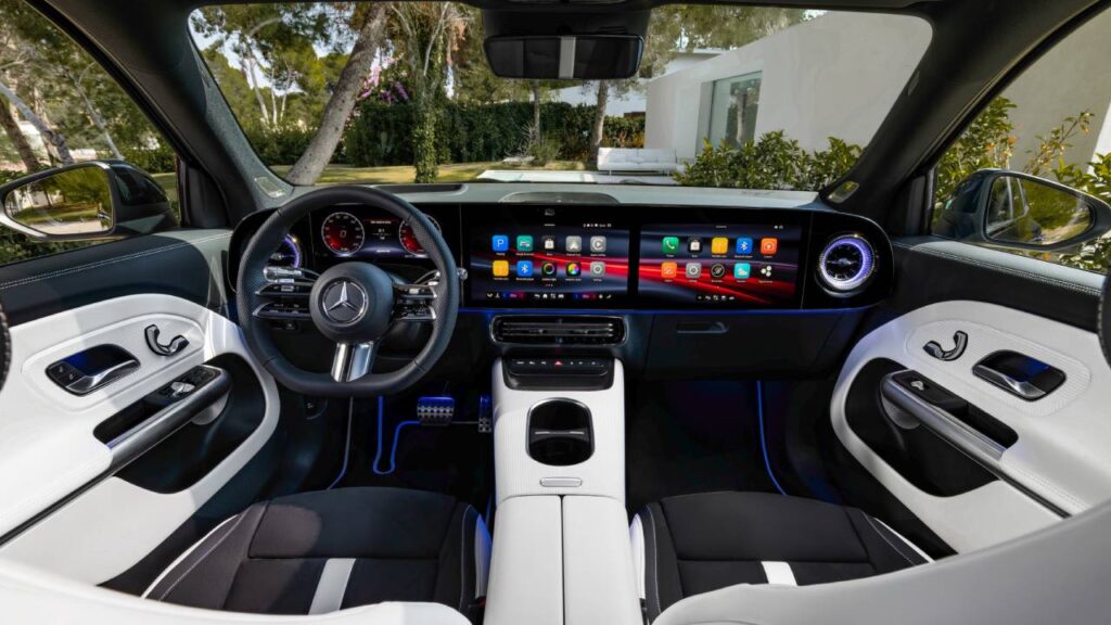 Yeni iç tasarım prensibi, havada asılı gibi duran MBUX Superscreen (isteğe bağlı) gibi birkaç ikonik yüksek teknoloji unsuruna odaklanıyor. Geniş cam yüzeyinin arkasında, sürücü için 26 santimetre (10,25 inç) ekran, 35,6 santimetre (14 inç) merkezi ekran ve ön yolcu için 35,6 santimetre (14 inç) ekran bulunuyor. Bir başka dikkat çekici özellik ise, ek bir saklama bölmesi bulunan, havada asılı gibi duran, sportif ve yüksek konumdaki orta konsol. Yeni direksiyon simidi ergonomik olarak tasarlanmış ve kullanımı sezgisel. Mercedes-Benz, çok sayıda müşteri talebine yanıt olarak, sınırlayıcı ve DISTRONIC için bir mandal ve ses kontrolü için bir roller’ı yeniden kullanıma sunmuştur.