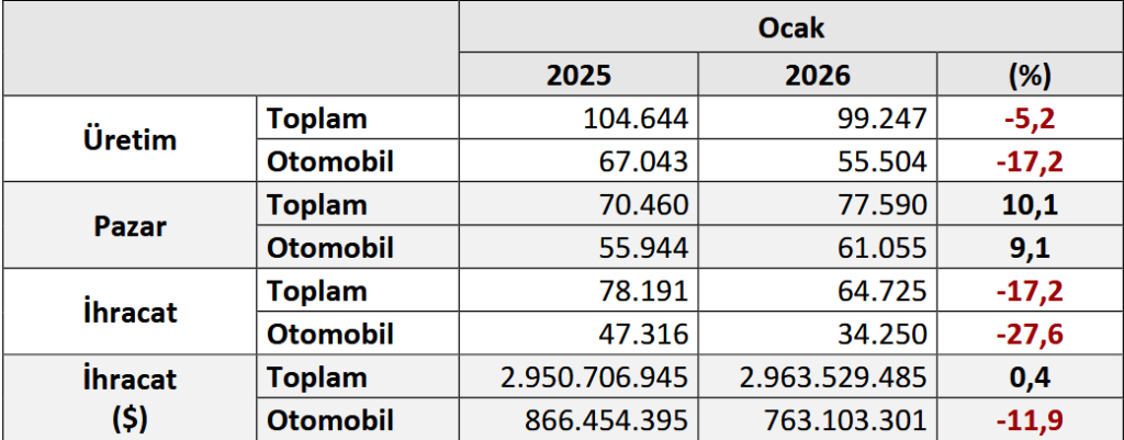 Otomotiv Sanayii Derneği tarafından paylaşılan verilere göre 2026 yılı Ocak ayında toplam üretim yüzde 5, otomobil üretimi bir önceki yılın aynı ayına göre yüzde 17 oranında azaldı. Bu dönemde, toplam üretim 99 bin 247 adet, otomobil üretimi ise 55 bin 504 adet düzeyinde gerçekleşti.